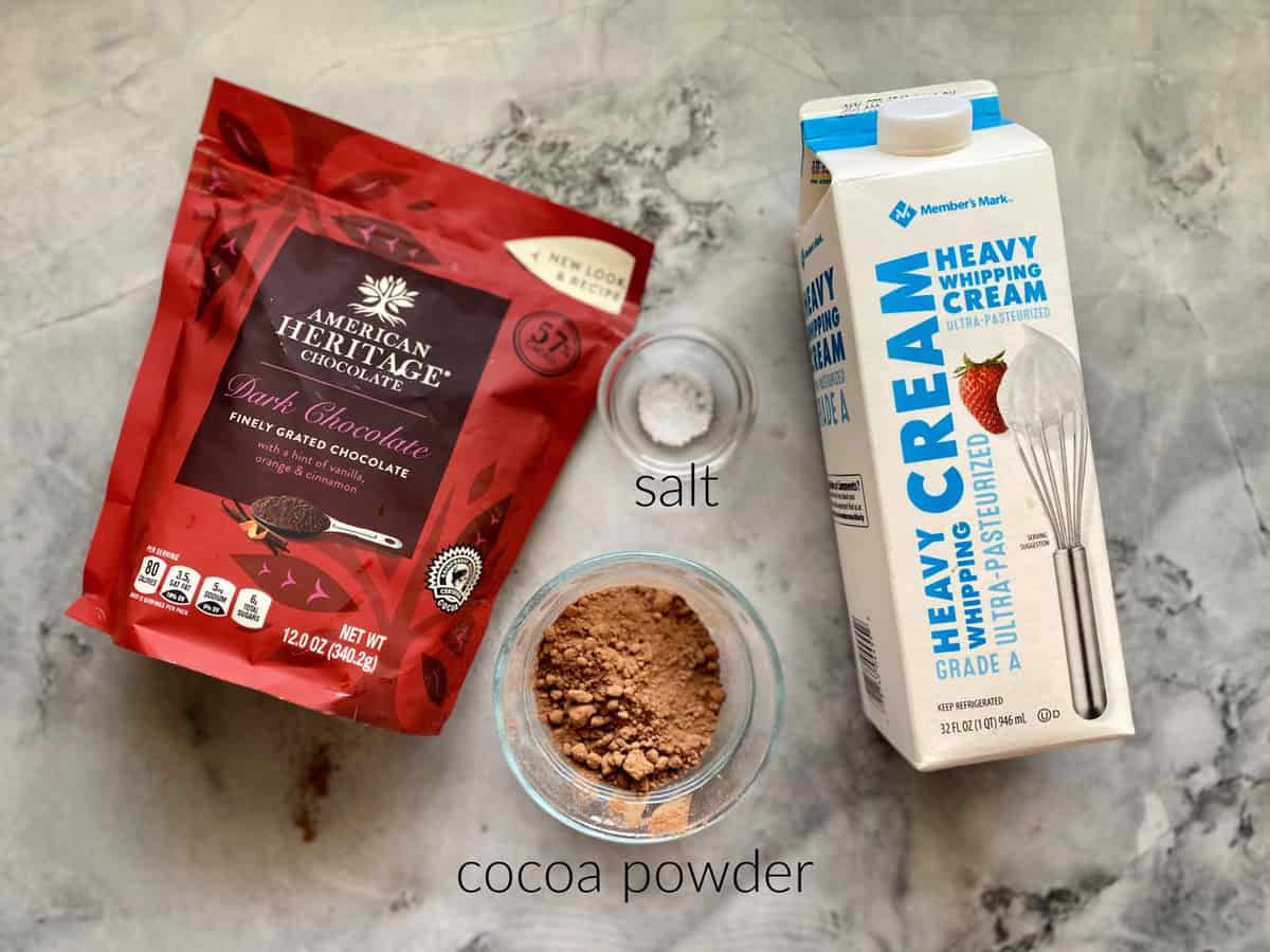 - Dark Chocolate – I have used both 100% dark chocolate which has no sweetener to it at all. OR I go the easier route and use the shaved chocolate above that only contains 57% cacao.