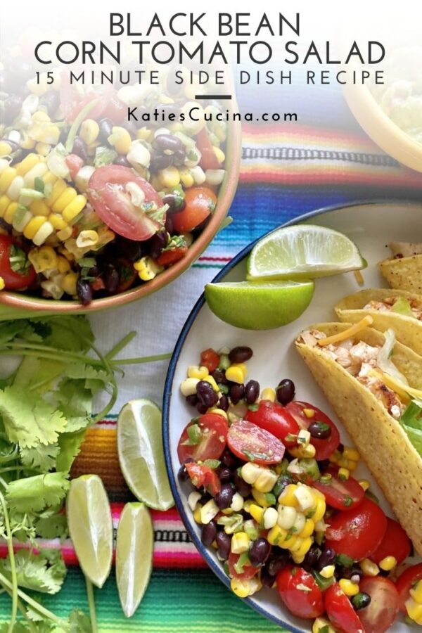 I love to serve this easy corn tomato black bean salad with my grilled chopped chicken tacos, beef and green chile enchiladas, grilled skirt steak and shrimp fajitas or even my chicken and cheese enchiladas.