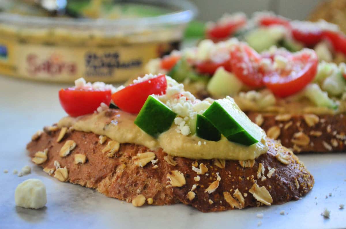 - Toast whole wheat oat bread until golden. Remove from toaster, slather on 2 tablespoons of Sabra Olive Tapenade Hummus on to each slice.
