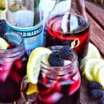 Put ice cubes in individual country jar glasses and pour sangria into glasses. Add a few additional blackberries and a slice of lemon to each glass. Enjoy.
